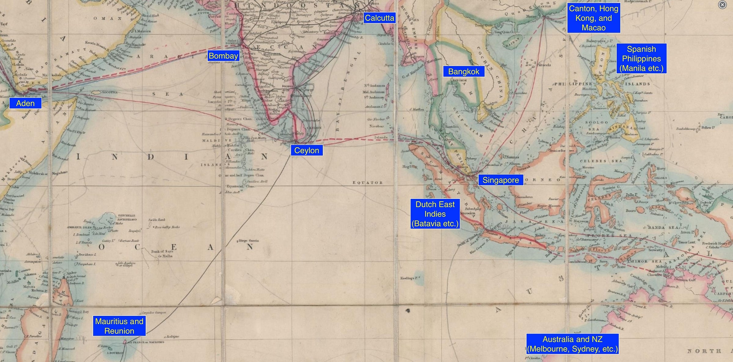 Figure 2. Extracts from ‘Map Showing the Steam Communication and Overland Routes between England, India, China and Australia.’ by W.H. Allen (1853). The extract above shows various places in the East that had the opportunity of routing their letters via India to connect with steamers sailing to the Middle East (generally Suez), overland across Egypt (see Figure 1), and then in the Mediterranean Sea to Europe.