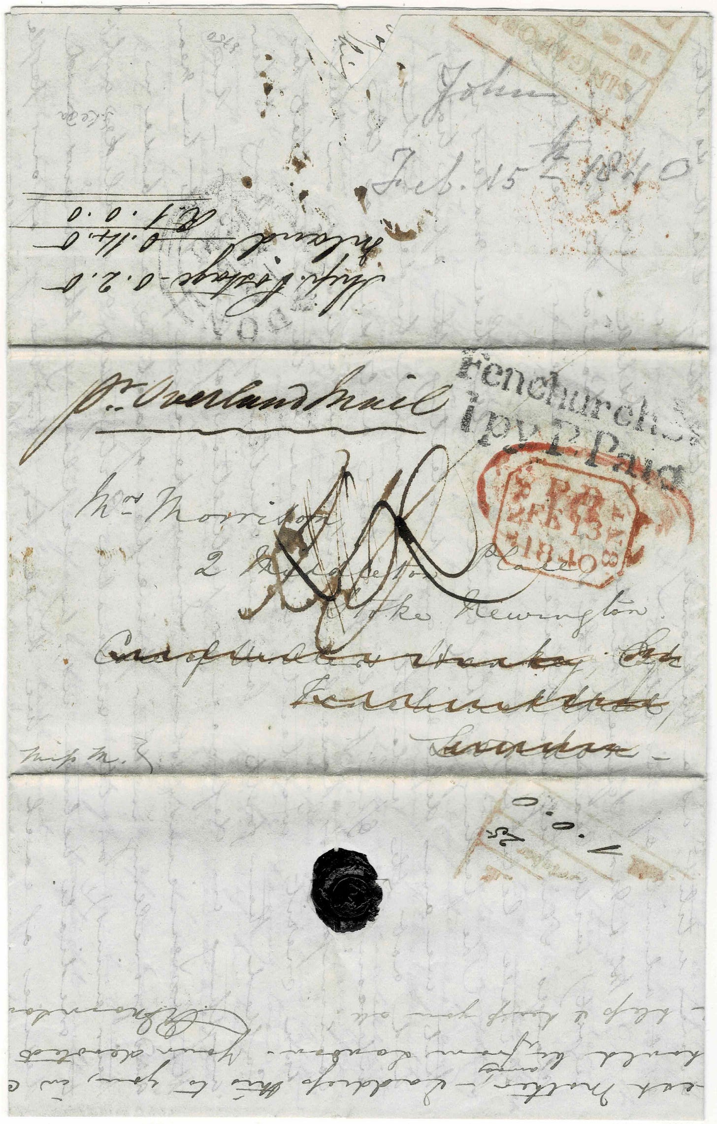 Figure 3. Earliest letter datelined 9 September 1839 written onboard the ship Fort William close to Hong Kong. Sent via Singapore, Calcutta, Bombay, and Marseilles to London.