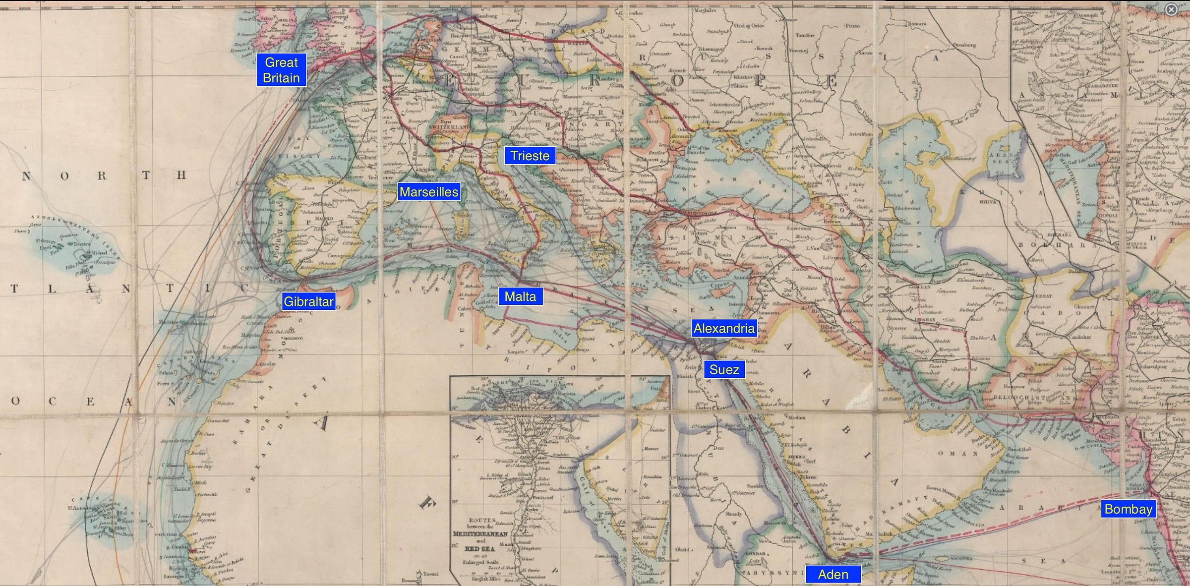 This extract shows some important ports in the Mediterranean and Europe. The three main routes to GB and Europe from Alexandria were: (a) the all-sea route via Malta and Gibraltar; (b) via Malta and Marseilles and then overland across France, and (c) via Trieste and then overland across countries in Europe